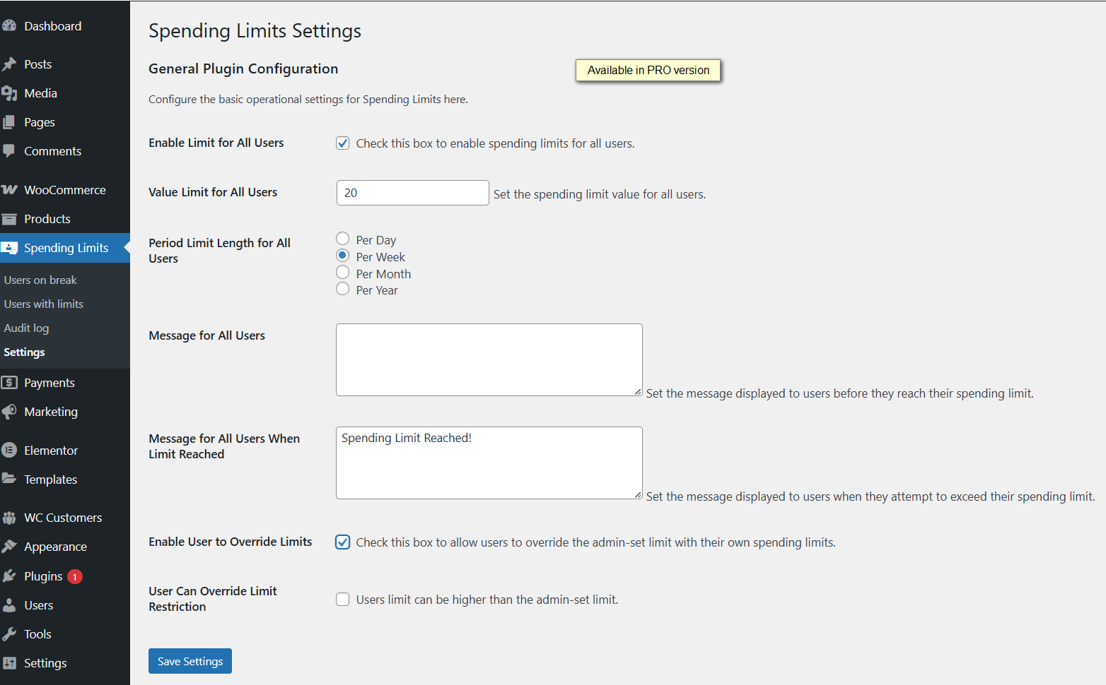 Option for global spending limit, custom limit period (weeks or days), reports pages where you can see list of users with their limits and locked out users. Along these reports there is audit log page. All pages have option to export data to CSV and date range filter. PRO version also comes with premium support.